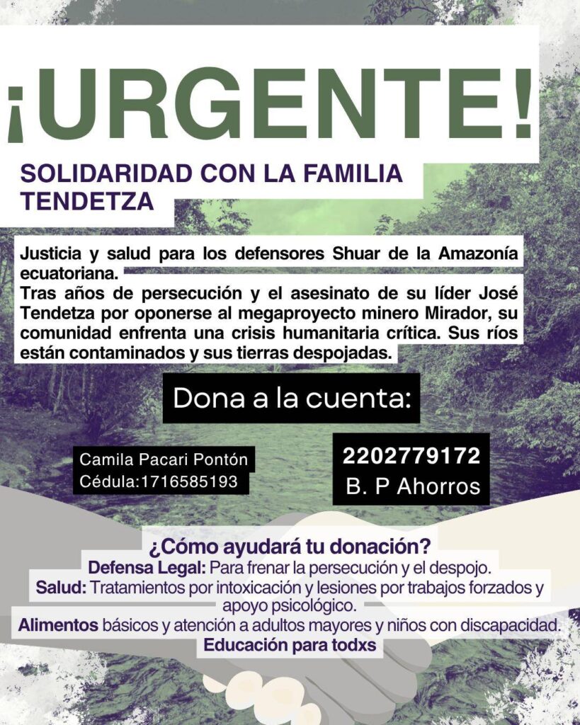 Habitantes Shuar de la Amazonía sur del Ecuador, la familia Tendetza ha sufrido despojo de sus tierras, contaminación de sus ríos, persecución y cárcel por parte del Megaproyecto minero Mirador. José Tendetza, uno de sus más conocidos lideres fue asesinado en 2014 luego de haber manifestado firmemente su oposición al proyecto minero. Su cuerpo fue hallado con signos de tortura, el 2 de diciembre de 2014 flotando en el río Zamora, atado con sogas, días después de su desaparición el 28 de noviembre.